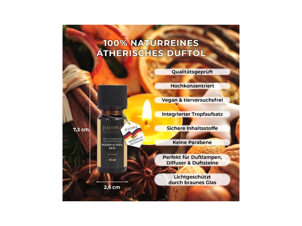 Naše esenciální oleje jsou vyrobeny v Německu s maximální péčí a důrazem na kvalitu. Každý produkt obsahuje 100% přírodní složení, bez jakýchkoli syntetických přísad. Díky vysoké koncentraci a výběrové kvalitě přinášejí intenzivní vůni a autentický zážitek aromaterapie přímo k vám domů.
